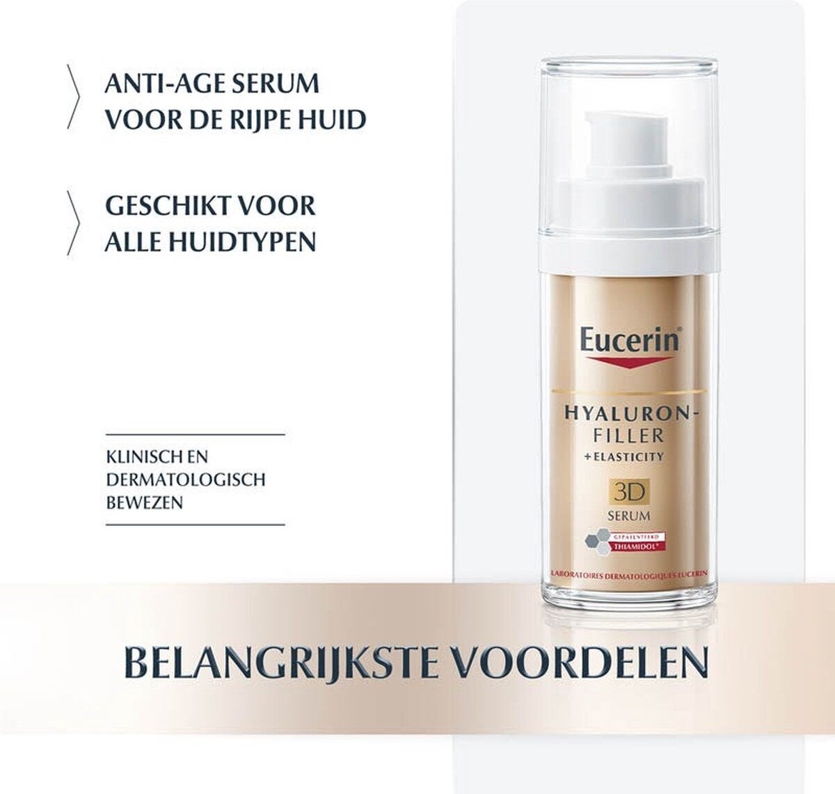 Van Eucerin Hyaluron-Filler + Elasticity 3D Serum is klinisch en dermatologisch bewezen dat het ouderdomsvlekken vermindert, diepe rimpels zichtbaar opvult, de elasticiteit verbetert en de huid er stralend en verjongd laat uitzien en aanvoelen.